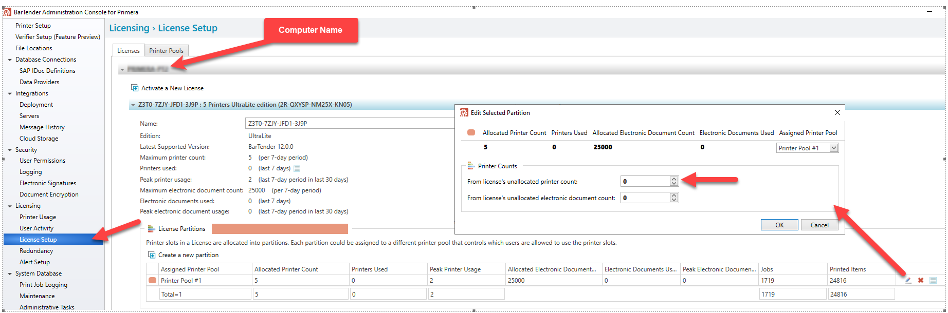 Go to Licensing - License Setup – Computer Name -License Partitions – Edit – Icon.