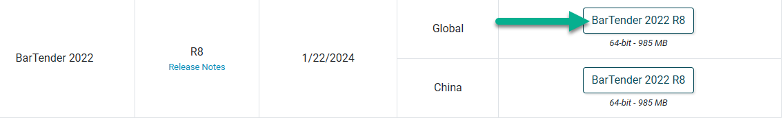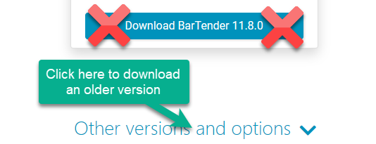 3. Download BarTender 2022. While the code usually works for newer versions it was designed for the 2022 version. Do not download the latest version. Instead click on Other versions and options. Choose Global: BarTender 2022 R8