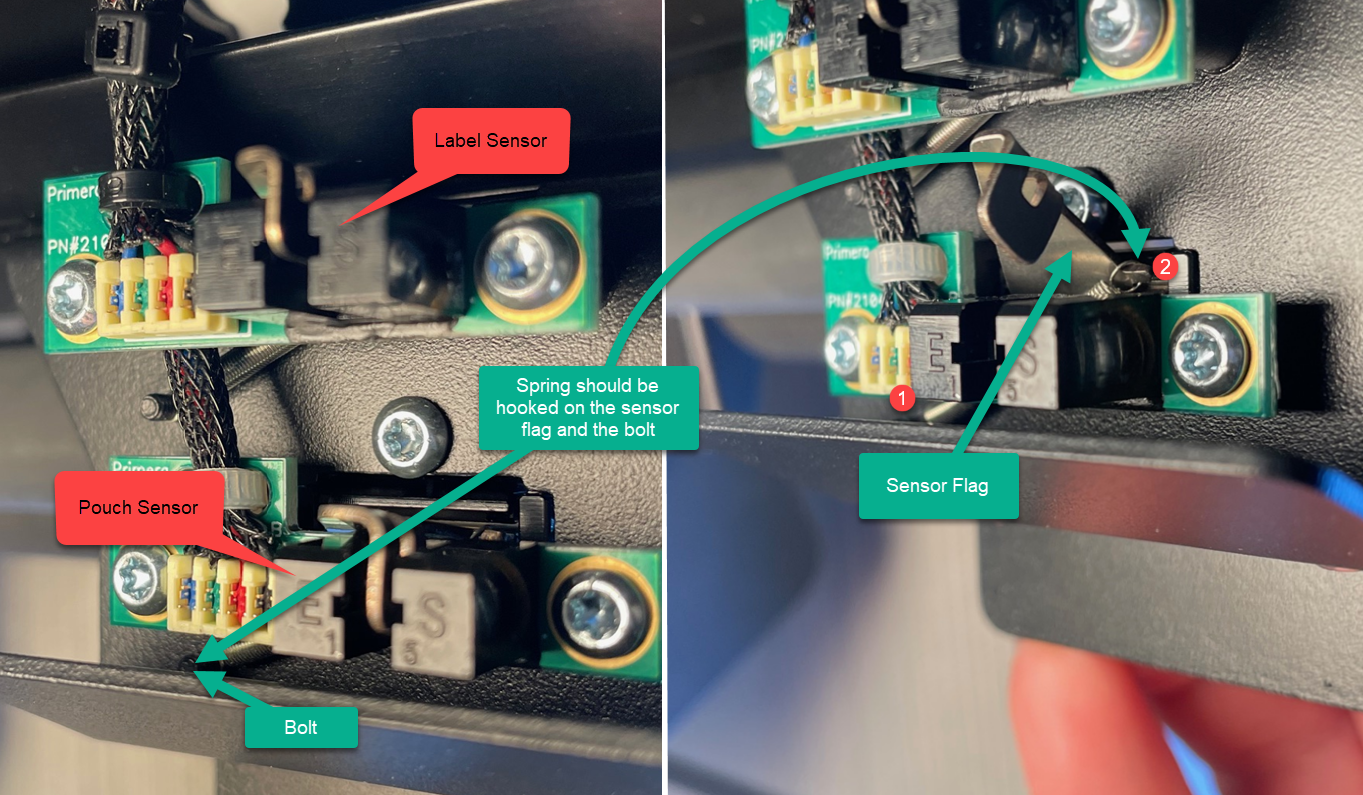 3. Locate the spring and ensure it is appropriately connected. One side should be connected to a small bolt protruding from the underside of the sensor bracket. The other should be connected to the hook on the sensor flag. See the image below