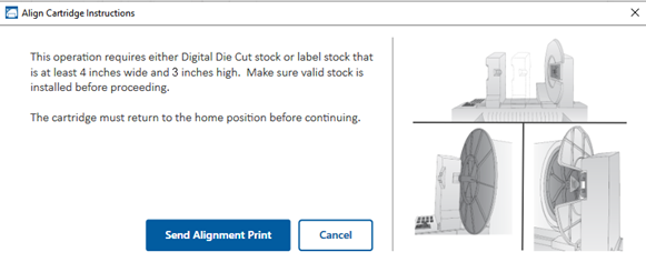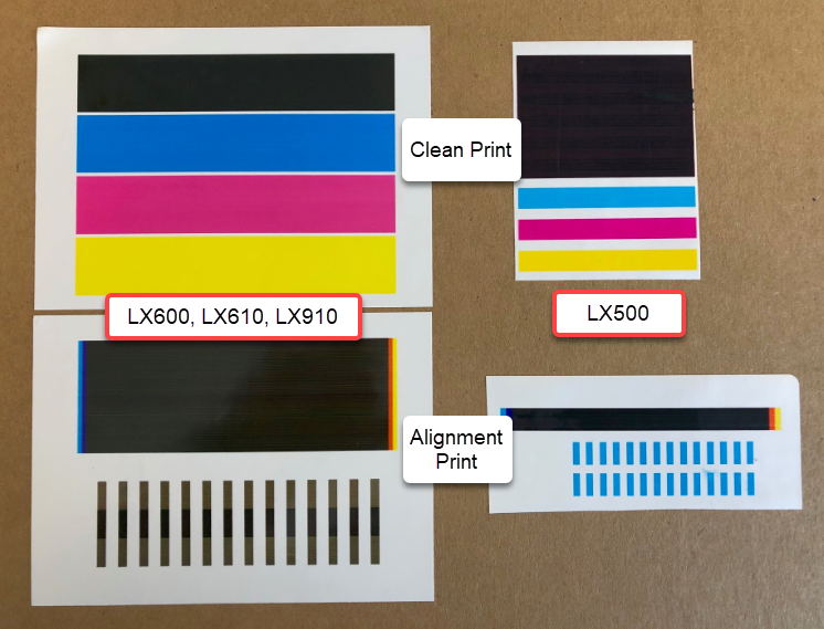 The LX600, LX610, and LX910 require at least 4x3 labels or digital die-cut stock (LX610). The LX500 requires at least 3x3 for the Clean Print and at least 3.5 x 1.5 for the Alignment Print. If this size is not available, you may substitute a sheet of standard paper cut in half along the length. Set your sensor mode to continuous. Load the cut paper. For the LX910 you will need a roll installed on the roll arm to trick the media sensor. Now press the Align or Clean button.