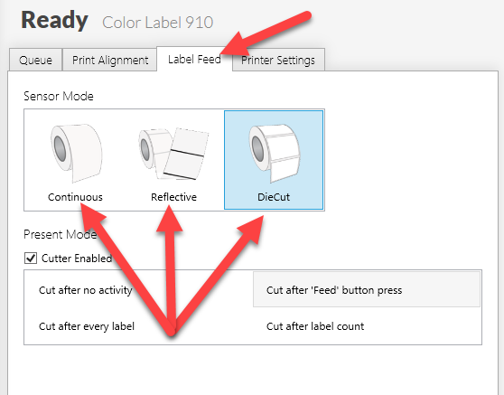 Match what your label stock looks like to the graphic above and choose the sensor type indicated. The shape or size of the label does not matter as much as the relationship between the label and the liner. In almost all cases your sensor type should be set to Die-Cut!
