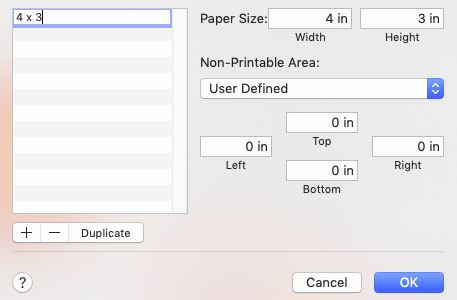 6. Click the + to add a new Custom Size. Ensure to input the correct width and height according to the labels loaded in the printer. All Margins should be at 0